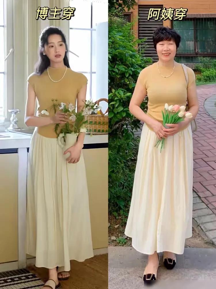 我们还可以用低饱和度暖色系的衣服单品来组合搭配,例如下面这种浅黄色的针织短袖上衣,搭配上杏黄色的半身裙,这样的穿衣配色展现出来的效果会更有女人味,温柔大方。