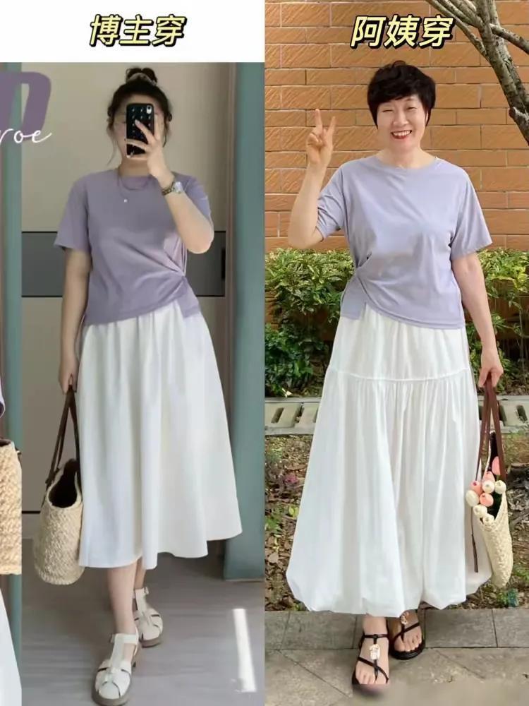 有时候年轻女博主的穿搭适合咱们中年阿姨穿,咱们就看下面这一件浅紫色的短袖T恤上衣,搭配上白色的伞状半身裙,这1套穿衣打扮给人的感觉很大气,主要的原因是色彩简约,衣服材质款式也符合咱们普通大众T恤上衣属于小宽松版,加上伞状款式的半身裙,能把脚胯宽,大象腿都藏起来。