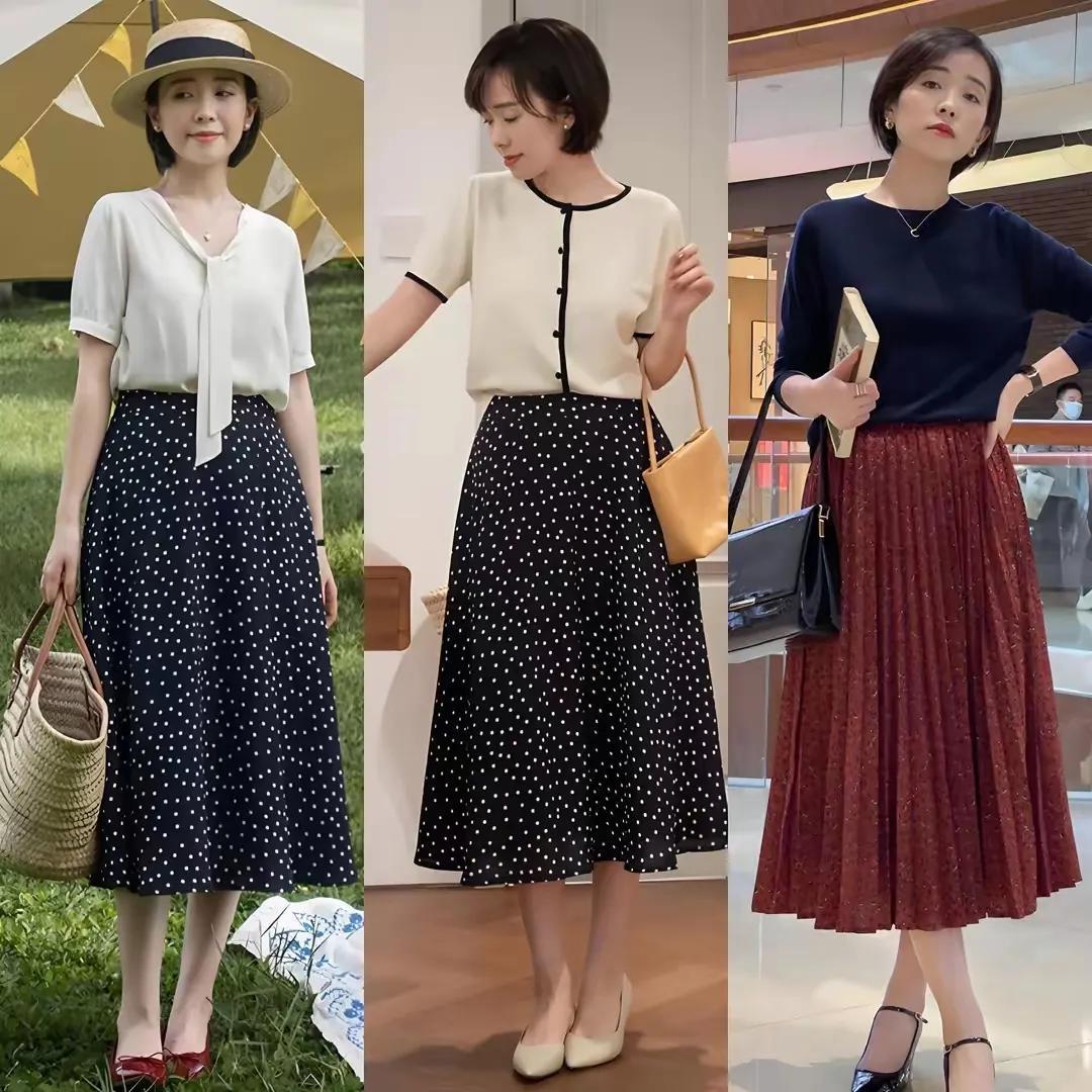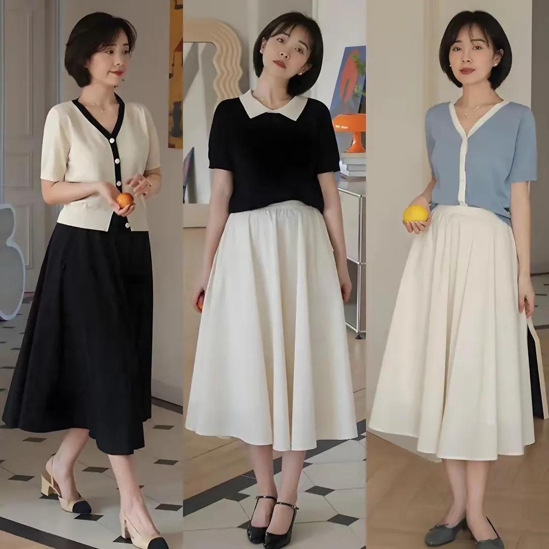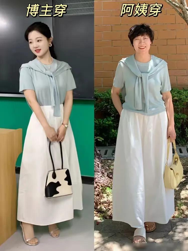 也可以采用上短下长的搭配,列如下面这一件白色的针织开衫或者是雾霾蓝的针织开衫,搭配上半身裙之后就能形成一个上短下长的搭配,短款的上衣搭配反身裙确实能使的穿搭这个身材比例型的三七分。