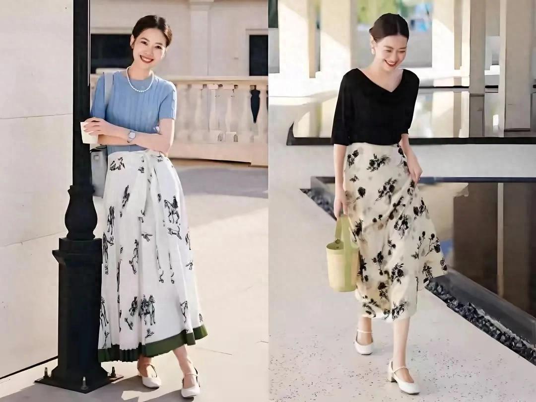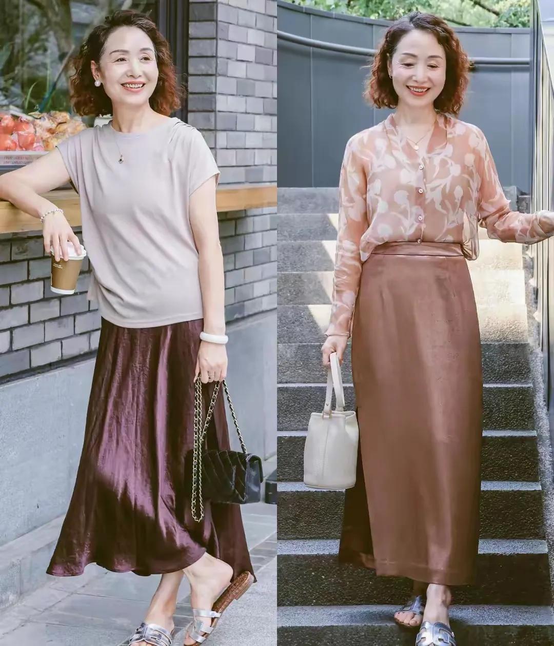 当然了,如果你不想学习年轻貌美的少女穿搭,而是更喜欢那种成熟稳重高贵优雅的女性穿衣风格,咱们可以学习下面这位大人一样,用一件印花的衬衫上衣搭配上大地色的缎绸面料半身裙,再加上微微的波浪卷发,就能穿出比较大气的风格。