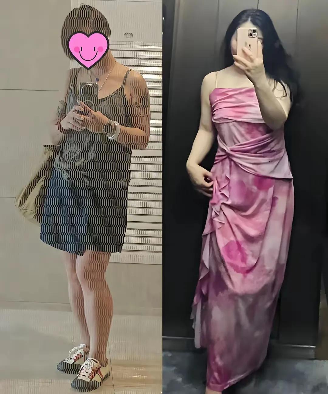 例如下面这两位素人抱着的穿搭示范,本身身材比较丰满,有点微胖,但是选的衣服材质色彩甚至是松紧度不过关,穿出来的效果并没有那种高贵和精致感,甚至穿一件吊带上衣和短裙,暴露自己大腿粗和手臂肥胖等问题。