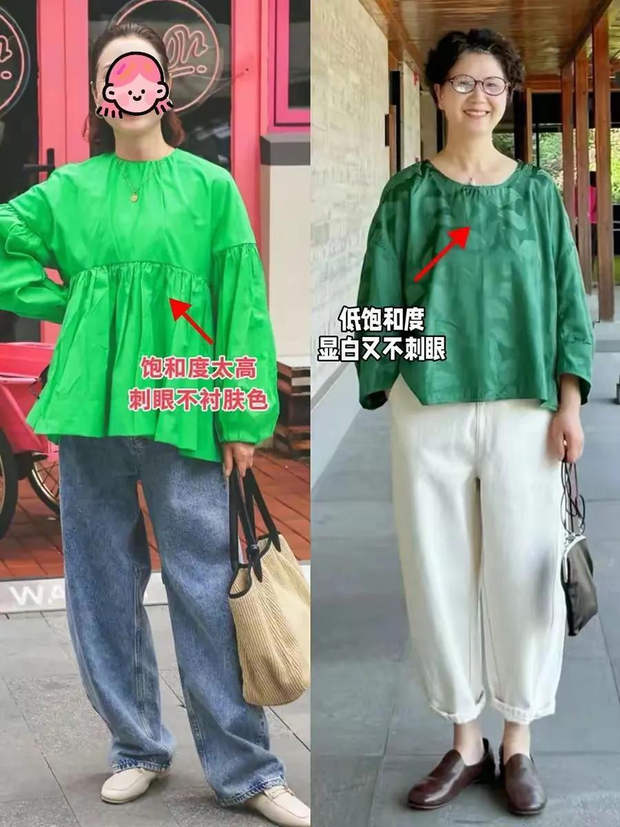 千万不要选择高饱和度色彩的衣服单品,下面这一件绿色的上衣,这样的颜色过于鲜艳,就算是搭配天生就拥有时尚元素的牛仔裤,也很难穿出高级感。