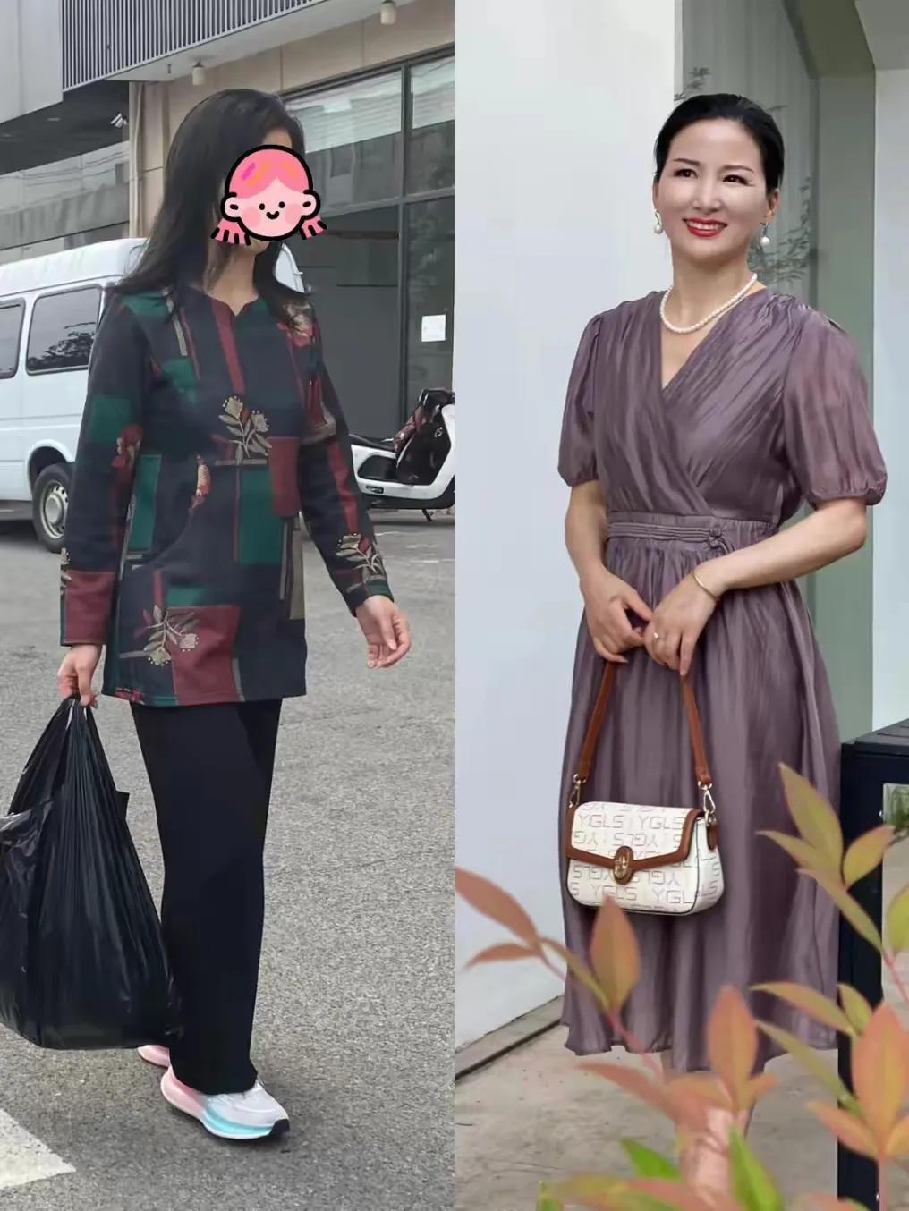 还不如选择右边的这一条浅紫色的灯笼袖高腰收腰款的连衣裙,搭配上精致的妆容和珍珠耳环还有项链,这样的穿衣打扮非常适合中年妇女,穿出来的效果秒变成“富太太”。