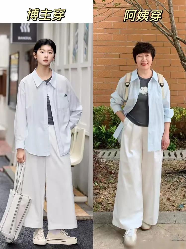 当下,穿衣打扮流行穿松不穿紧,宽松版型的衣服裤子更容易把身材的一些缺点遮住,例如下面浅蓝色的衬衫,内搭小宽松的灰色T恤上衣和白色的阔腿裤,轻轻松松穿出显高显瘦的造型。