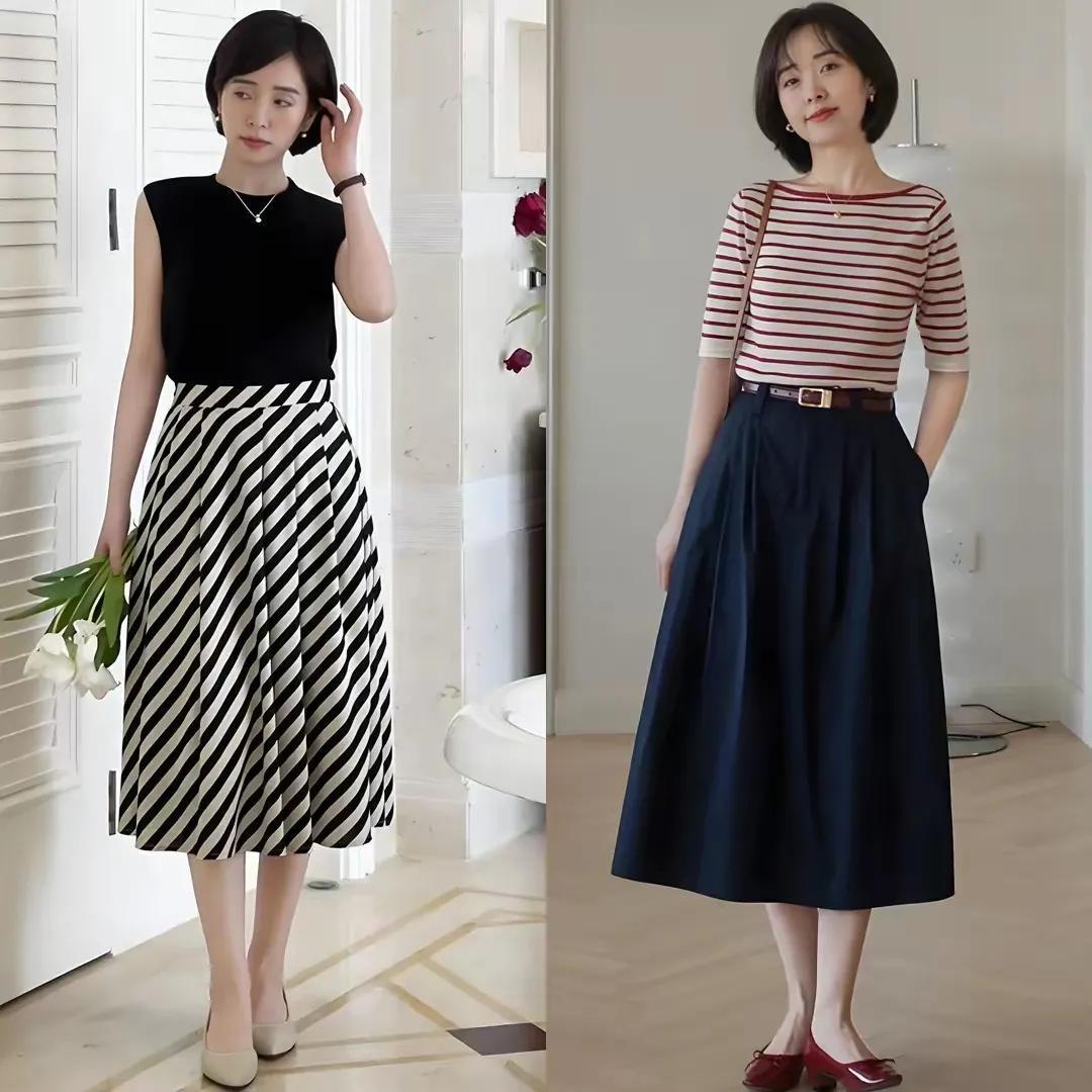 如果你是小个子女生,我们不妨学习下面这位达人,因为这位博主身高比例是在1米60以下,但是看到他的穿衣打扮完全不像小个子女生。不得不说,他真的很会搭配用条纹的上衣,搭配上半身裙,不管什么样的色彩,衣服都会把上衣的衣角塞进裙子里面来,提升腰线,达到显高显瘦的效果。