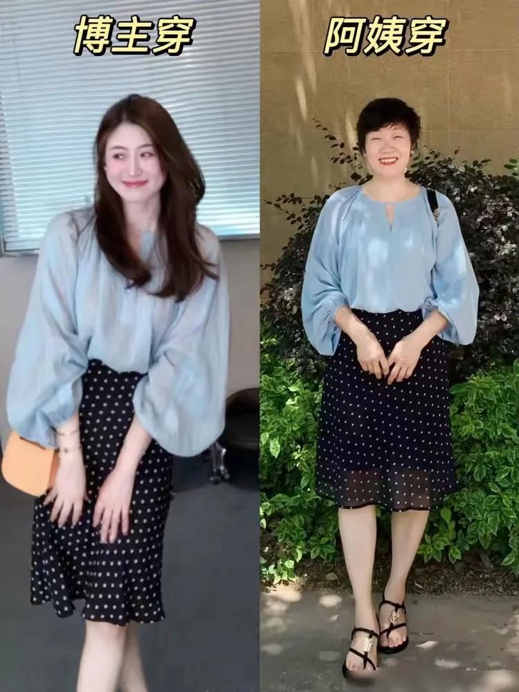 浅蓝色的衣服,天生就拥有时尚元素,例如下面这一件立领的浅蓝色衬衫,上衣穿在身上之后就修饰肤色显白,显得显年轻,再搭配上一款黑白不点的半身裙就够,这样的穿衣打扮,年轻的女性穿的很靓丽,阿姨穿了显年轻。