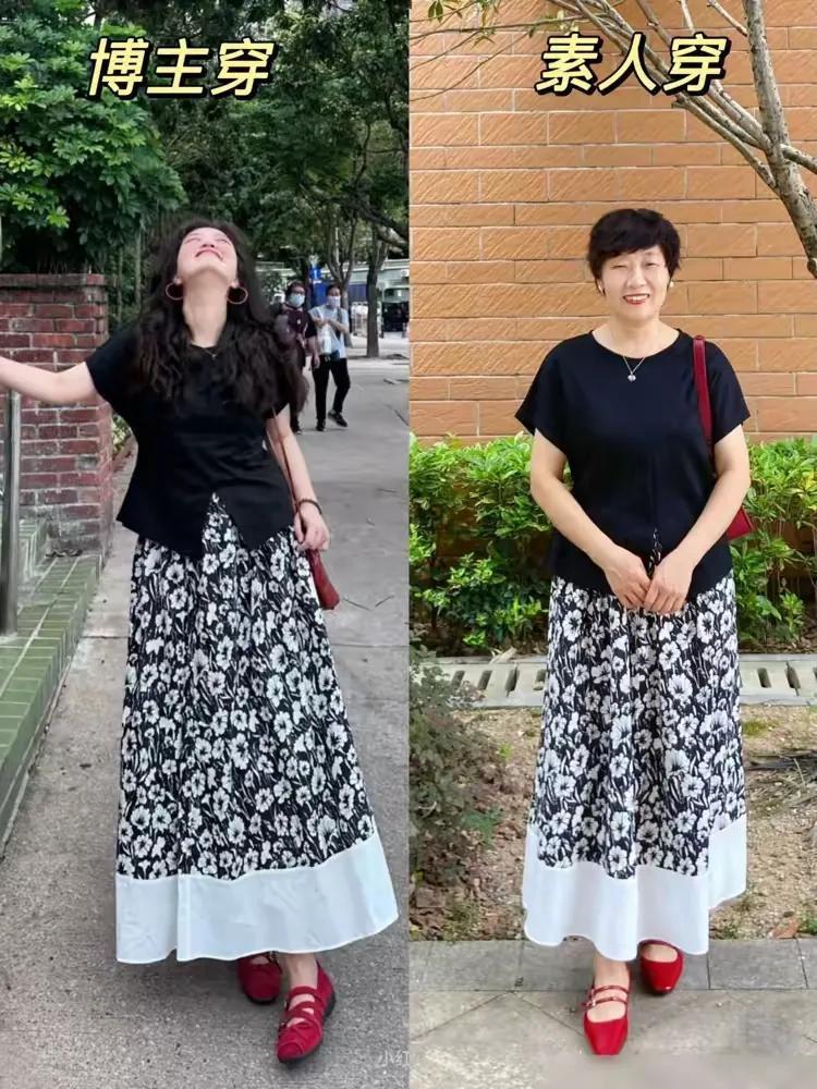 有时候我们可以用“繁简结合”的配色技巧,例如下面用的都是黑色的短袖上衣,搭配上黑白印花的半身裙,印花的裙子放在下半身之后,我们的视觉重心就会往下一看,整套造型不会显得凌乱,反而会很精致,而且他还用红色的包包,还有红色的玛丽珍鞋来点缀正个造型,杨色彩不会那么的单调,而且红色和黑色组合在一块是非常经典的色调。