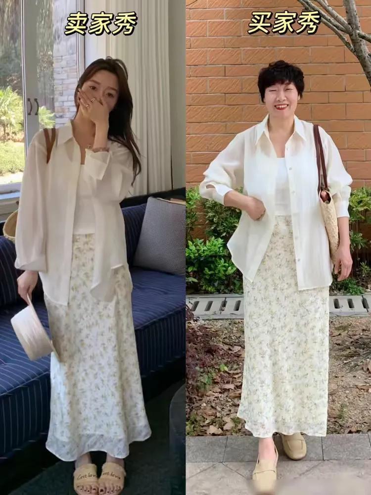 其实有的时候只要衣服的质量过关,版型合身,配色简约,不管是买家秀还是卖家秀,穿在身上账号都会很上档次,例如下面用白色衬衫内搭白色小吊带和碎花的半身裙,展现出来的效果就很简约,美少女穿搭活力四射,中年女性穿了显得干净利落,而且优雅大方。