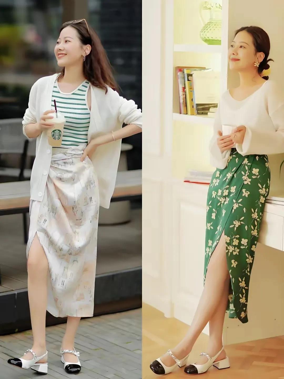 身材比例不错的情况下,我们还要懂得松紧结合,例如下面一件白色的小外套,内搭立白条纹的修身款背心,下半身搭配缎绸面料的开叉半身裙,脚上穿的是一双拼接色的玛丽珍鞋,这样的穿搭很容易展现出你凹凸有致的身材变得更加迷人。