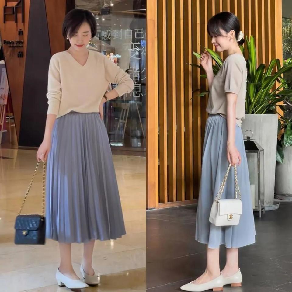 正常来说,选择鞋子颜色也要遵循整双鞋子,不要超过三个色调,如果设计过于花里胡哨的情况下,穿在脚上其实并不洋气,还不如选择黑白灰或者是纯色系的鞋子来搭配。例如下面用米白色的羊皮材质,浅口单鞋搭配上雾霾蓝的半身裙和短袖上衣,这一身穿衣打扮就很精致,而且优雅得体。