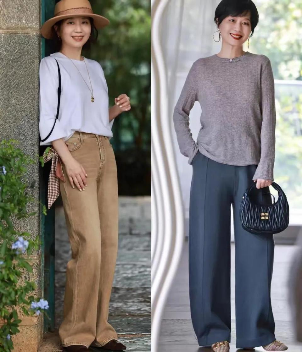 咱们还可以选择指挥的针织上衣搭配上灰色的阔腿西裤,脚上穿了一双粗跟的单鞋,也可以选择白色的上衣搭配上大地色的牛仔阔腿裤,头上戴的一款草帽,做两身穿衣配色普通大众女性照着穿也不会出错。