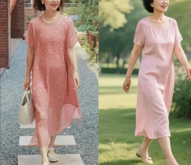 到了五六十岁的中年女性尽量不要穿过于刻意装嫩的色调,例如下面这种粉色的连衣裙,特别是左边的这一条连衣裙,面料阔以单薄,有点半透的感觉,上就没有那种高贵感。