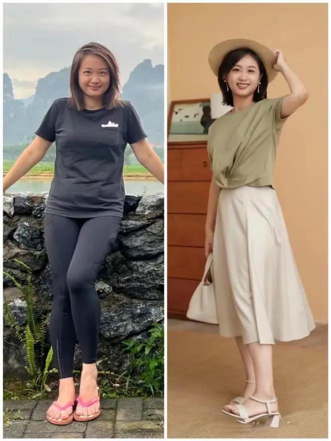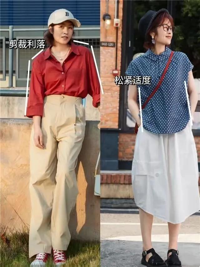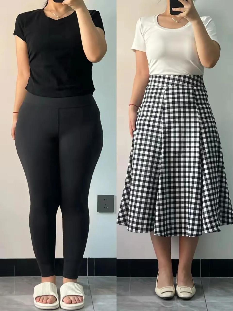 咱们来看下面这位博主的穿搭对比,如果是发福发胖,腿型粗、假胯宽,这个时候你只要不穿紧身裤,紧身衣就行,直接换成白色的短袖T恤,搭配黑白格纹的散装半身裙,就能达到遮肉显瘦的效果,简约又大气。