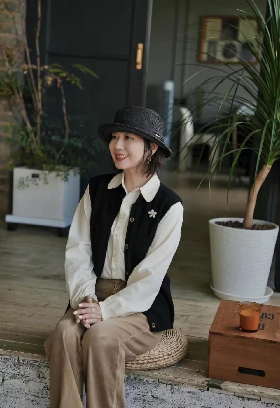 有的时候年龄越大,选择的衣服颜色尽量避开花哨的款式,或者是过于鲜艳的色调,反过来选择浅色系基础色,穿出来反而会更经典耐看,例如下面用黑色马甲内搭杏色的衬衫,加上一款大地色的阔腿裤,这一身穿衣配色形成一个撞色的效果,层次感分明,而且衣服颜色穿搭也很大气。