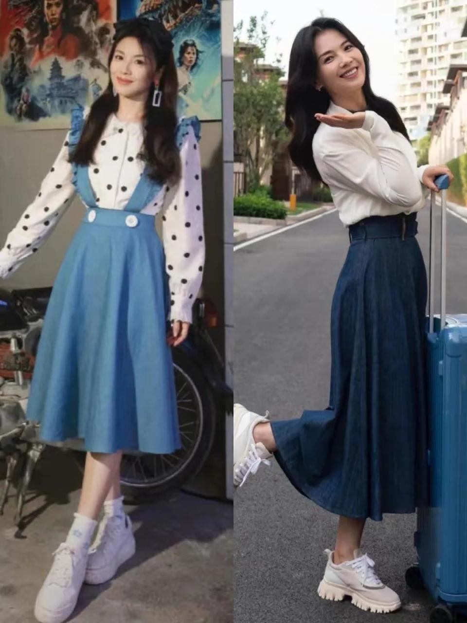 当然啦,如果想要降低出错率,还是选择纯色系,浅色系的衣服来穿搭,例如下面用一件白色的上衣搭配上蓝色的牛仔半身裙,脚上穿了一双休闲运动鞋,结合上大波浪的卷发造型,这一身穿衣打扮就显得优雅大气,而且还显得很减龄。