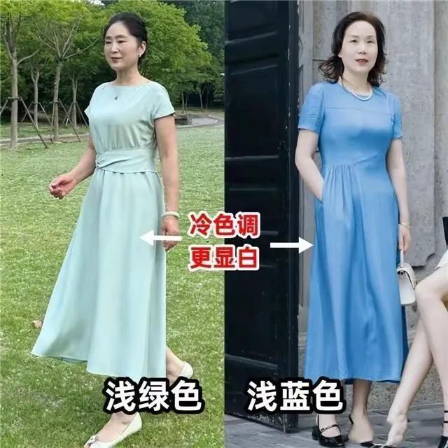 如果你选择的是中等面料的衣服单品,可以选择冷色调的衣服颜色,例如下面浅蓝色的连衣裙,或者是浅绿色的连衣裙,穿在身上也很有品质,而且修饰肤色显白显嫩。
